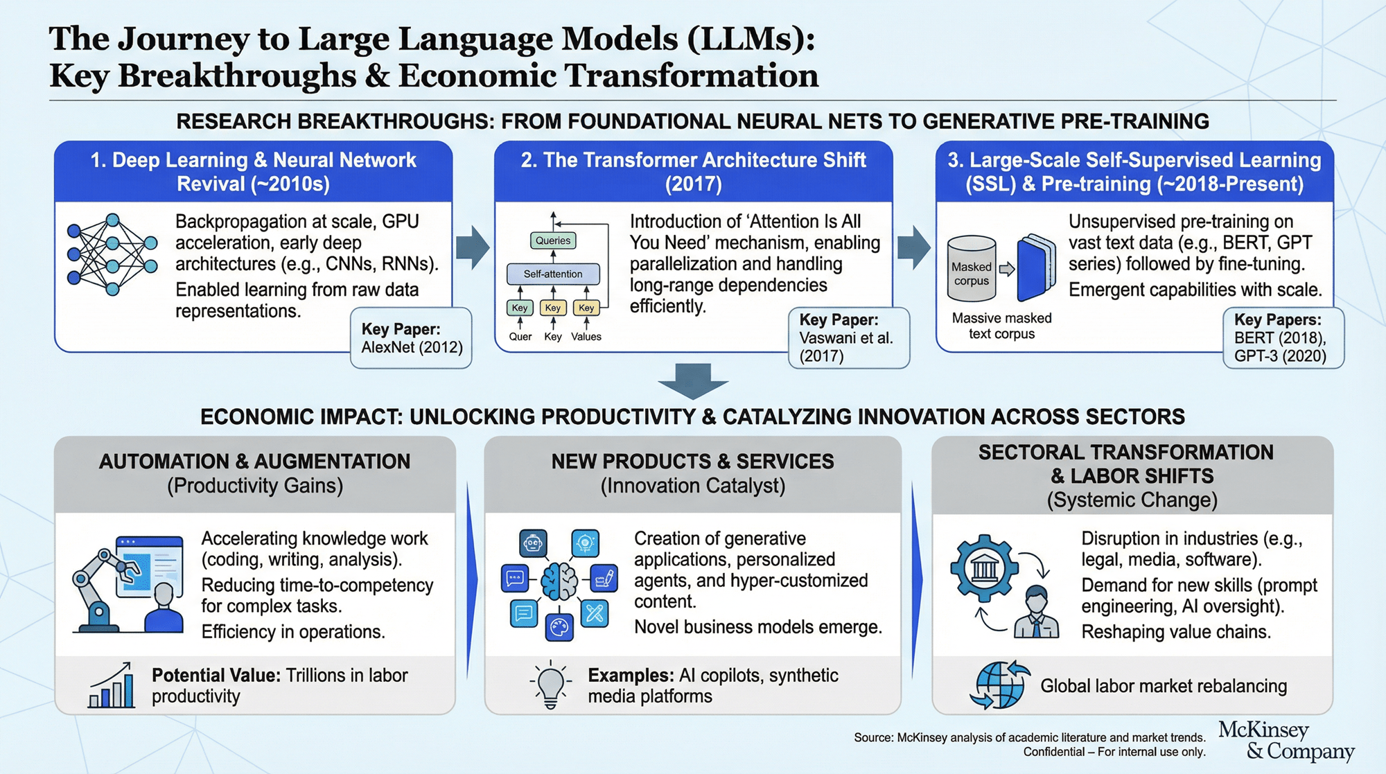 Create a McKinsey style slide explaining the key research breakthroughs that led to the development of LLMs and their impact on the economy