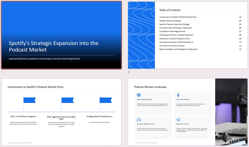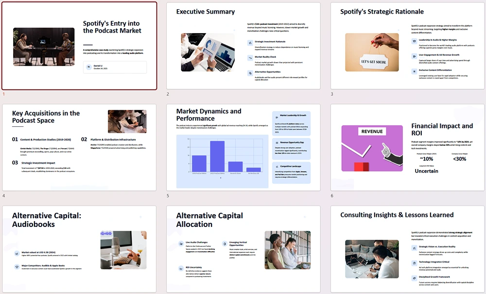 • Prompt 2: Create a case study on Spotify's entry into the podcast market and whether or not they could have better spent the capital on acquisitions on a different business line. Use a consulting style slide template to present the data and insights.