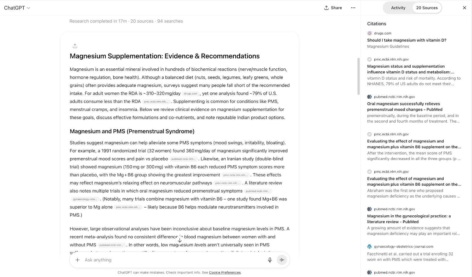 ⚠️ Note: Don’t take medical advice from ChatGPT, deep research or not. I had already tested my magnesium levels and was on a doctor-prescribed supplement at the time of running this research. I did this experiment to validate my results.
