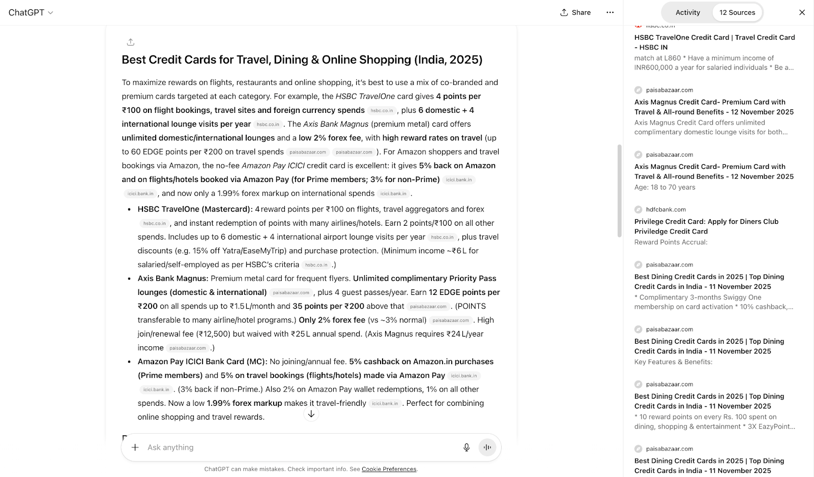 I would’ve preferred ChatGPT to use only official bank websites to share information, and maybe complement that with Reddit or other social sites to help me understand real users’ experiences with these cards. Maybe specifying this preference in the initial query would’ve helped.