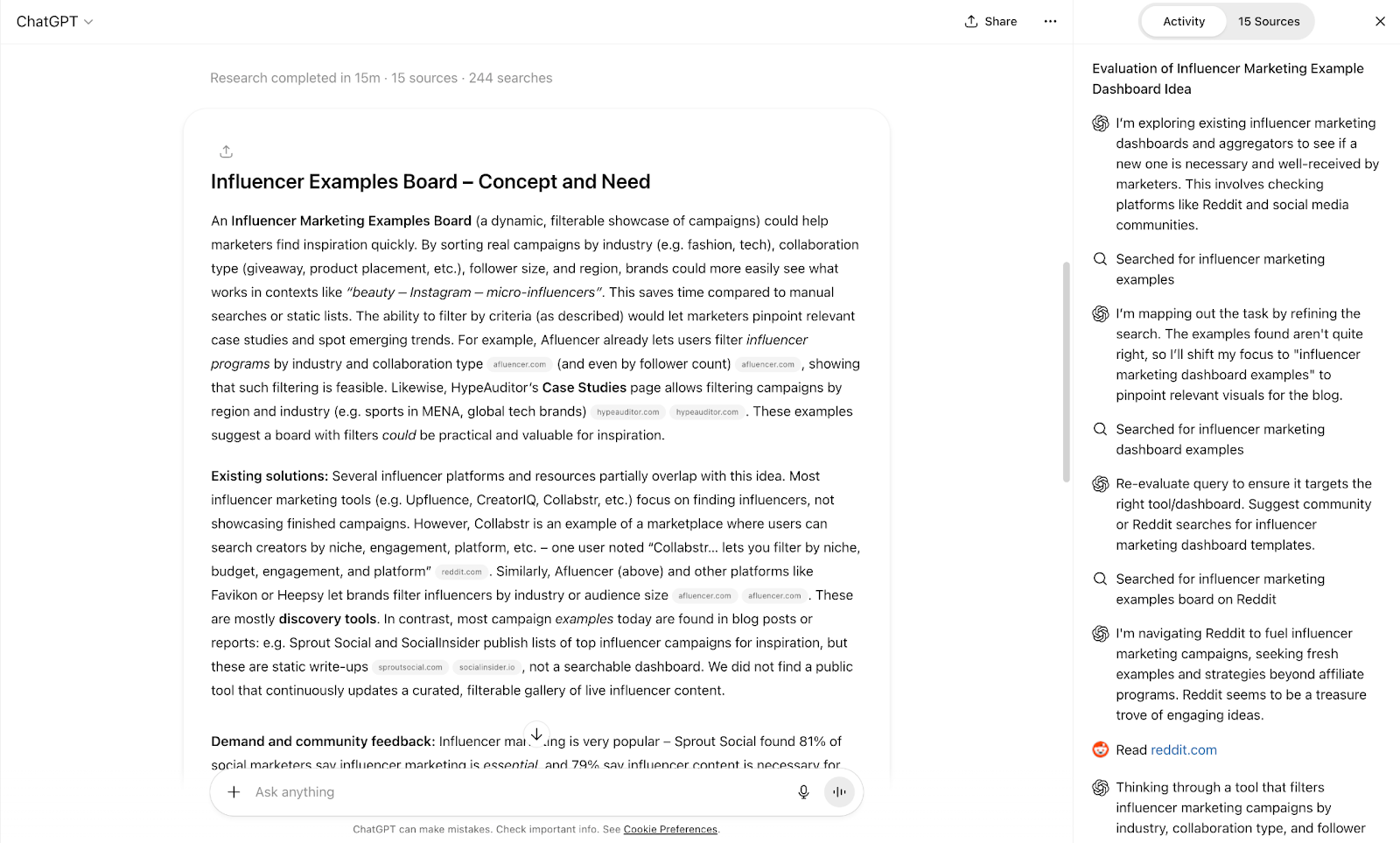 Premise: I asked ChatGPT to critique a business idea I was noodling with. The idea was to create an influencer marketing examples dashboard with filters for location, collaboration type, influencer size, etc. It’d be updated frequently to remain fresh and relevant. I wanted to know whether marketers actually need this product, or if a version of it already exists.