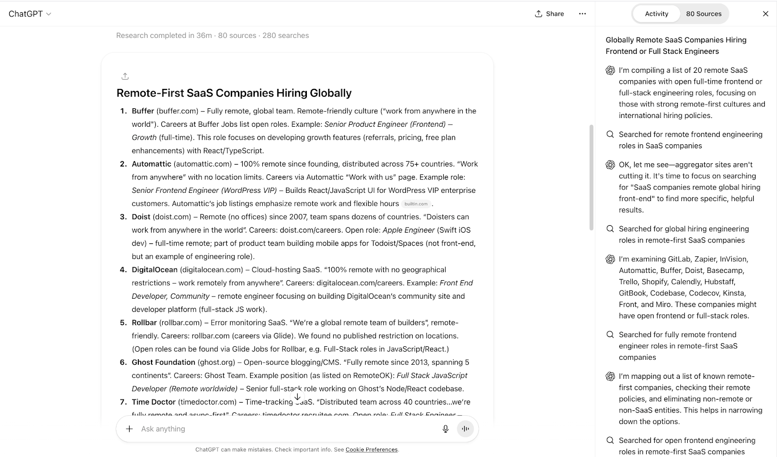 But I think adding three tasks to a single deep research query (software engineer roles, fully remote, no time zone restrictions) actually threw the tool for a loop, and it returned inaccurate results.