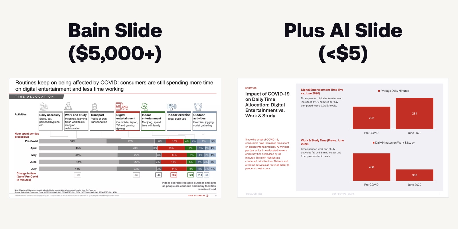 To compare a Bain presentation with a presentation generated using Plus AI, take a look at the visual below. Pretty cool, right? Visually, the quality of both is phenomenal.