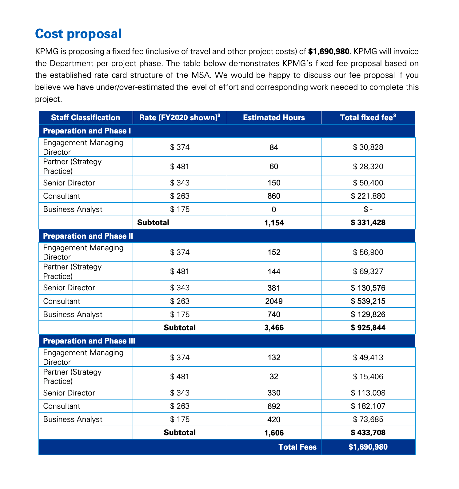 In one proposal example, I saw KPMG charging an overall project fee of $1,690,980. The hourly rate here is lower than that of the top strategy firms—the partner charges $481/hour and the consultant $263/hour. Expect prices to be upward of $250/hour minimum.