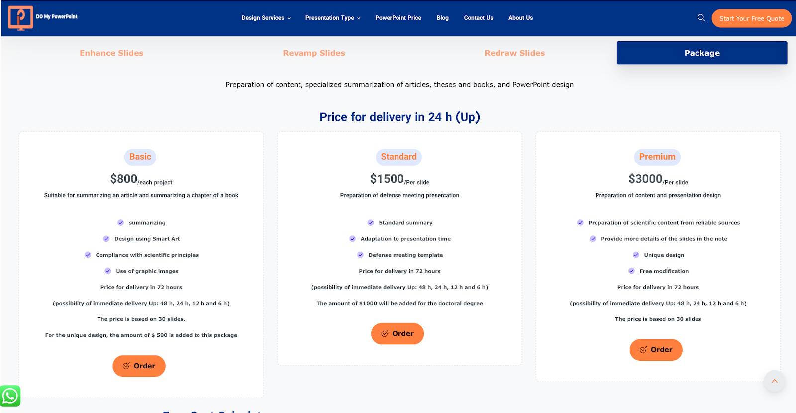 Agencies like Do My PowerPoint and 24Slides charge based on the scope of work. For revamping your presentations, the cost is as low as $22/slide (Do My PowerPoint). But the premium packaging—including everything—costs $3,000 per slide.