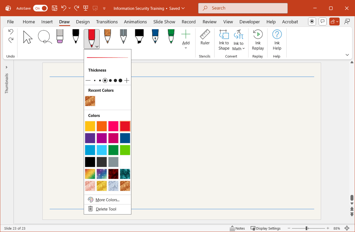 - Choose one of the Drawing Tools and click the arrow that appears on the button to change the color or line thickness.