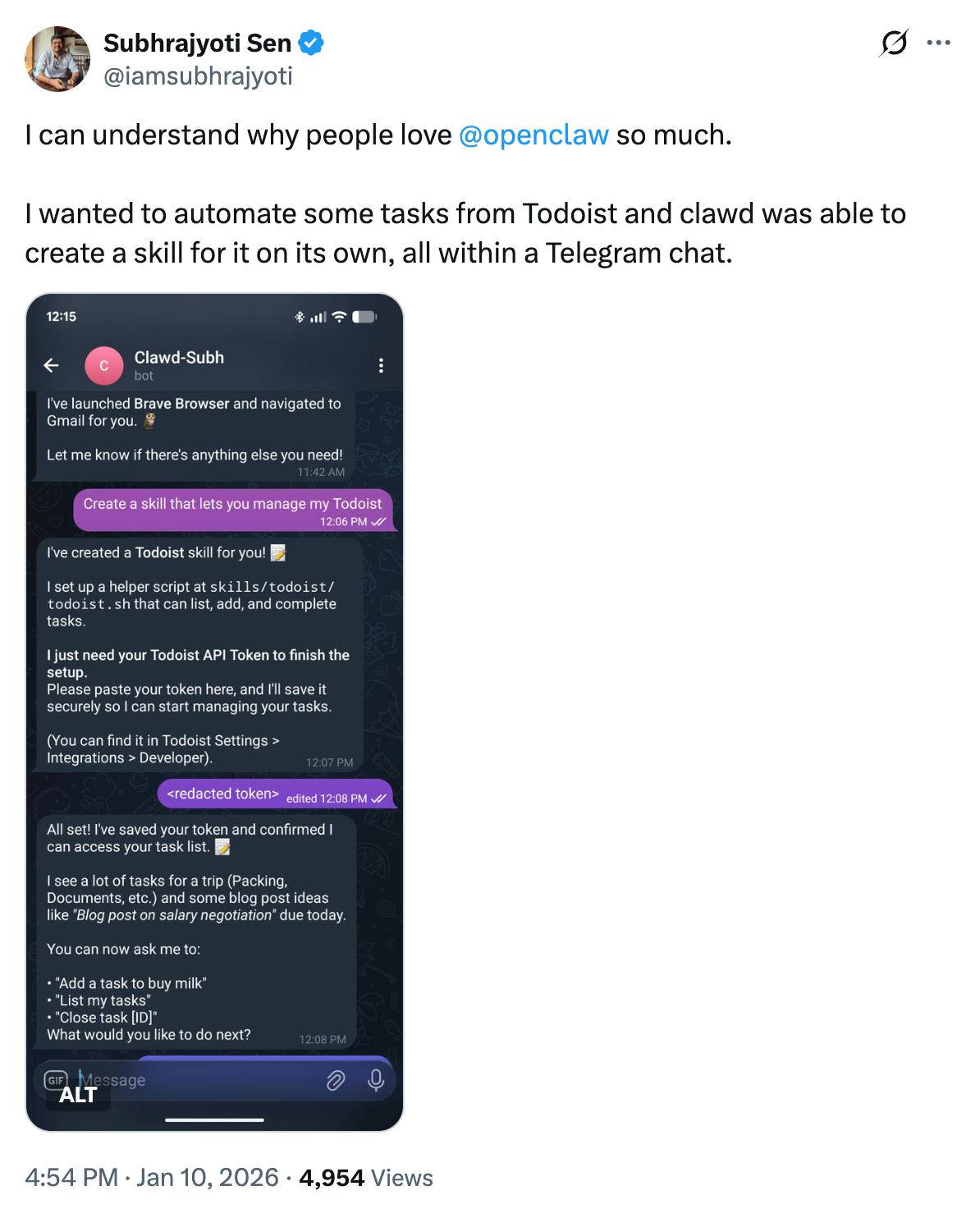 One user described asking their agent to create a Todoist automation mid-conversation: “I wanted to automate some tasks from Todoist and Claw was able to create a skill for it on its own, all within a Telegram chat.” The agent handled the entire build without the user touching a config file.