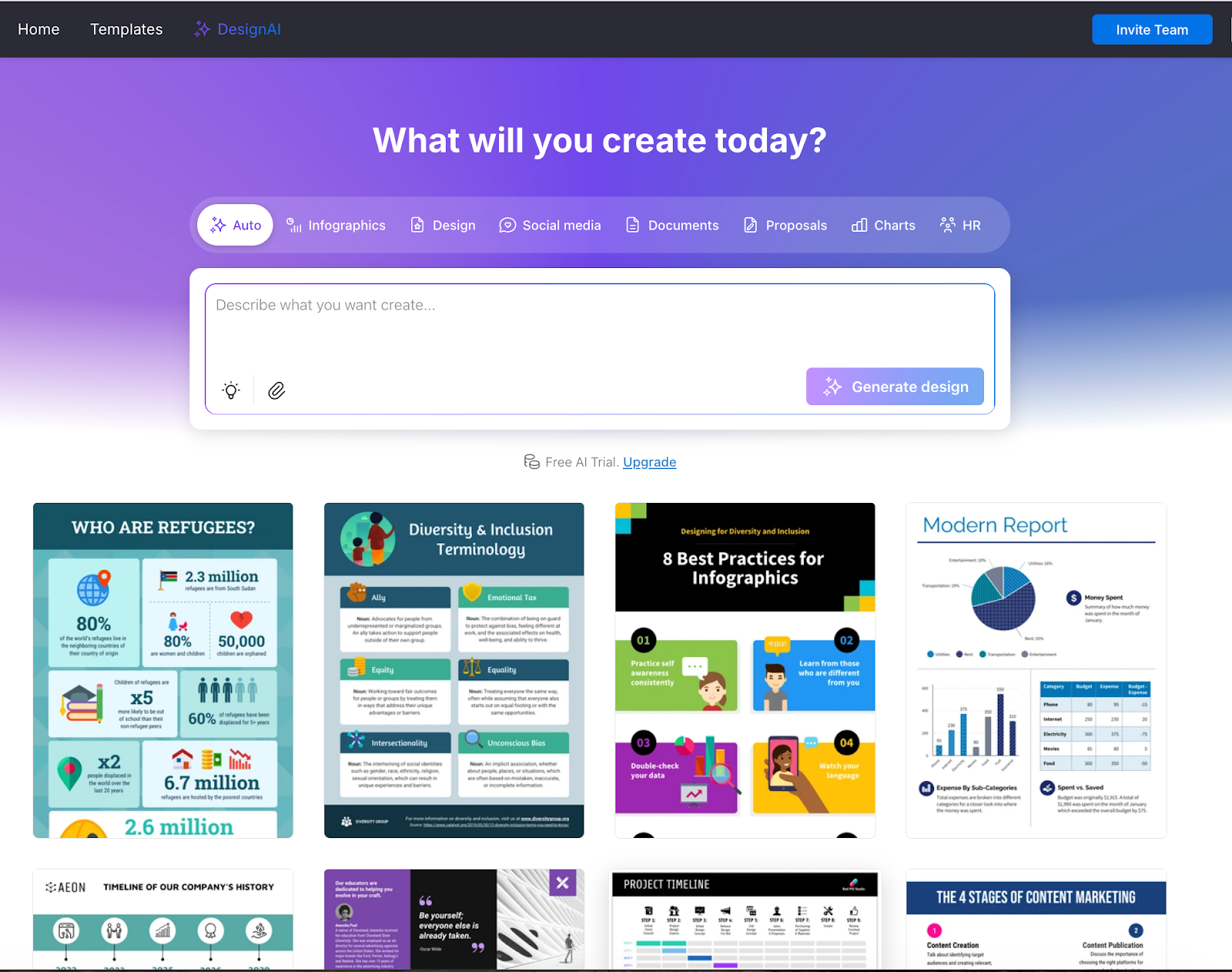 Venngage es una solución de diseño basada en inteligencia artificial creada específicamente para resolver este problema. Puede generar infografías profesionales, informes detallados, visualizaciones de procesos y cronogramas de proyectos mediante sencillas instrucciones de texto.